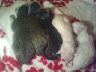 Synnytys sujui hyvin ja Tamila eli Hilma hoiti kaiken hienosti, vaikka ensimmäinen pentu, jättiläismäinen sininen poika, olikin hyvin tiukassa. Onneksi sen jälkeen loput pennut syntyivät helposti ja melko nopeasti - paitsi viides putkahti maailmaan huomattavasti muita myöhemmin.